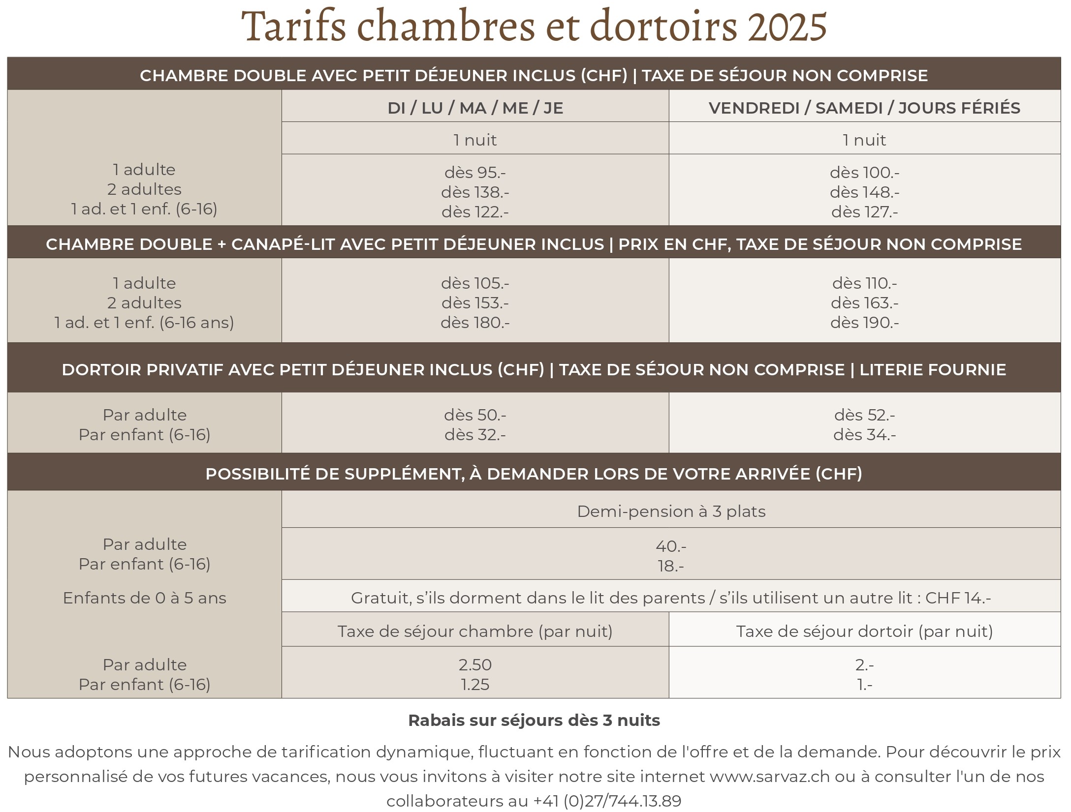 Unsere Zimmer, die von Hotelleriesuisse als „Swiss Lodge“ und „Bike Hotel“ klassifiziert wurden, bieten kompromisslos modernen Komfort. Jedes Doppelzimmer verfügt über ein voll ausgestattetes Badezimmer (Dusche, WC, Waschbecken, Haartrockner), einen Flachbildfernseher, einen Safe, einen Wasserkocher, eine Kaffeemaschine mit Kapseln, eine Klimaanlage und einen Internetanschluss (Wi-Fi und Kabel). Ein geräumigeres Zimmer mit Schlafsofa bietet Platz für bis zu 2 Erwachsene und 1 Kind.